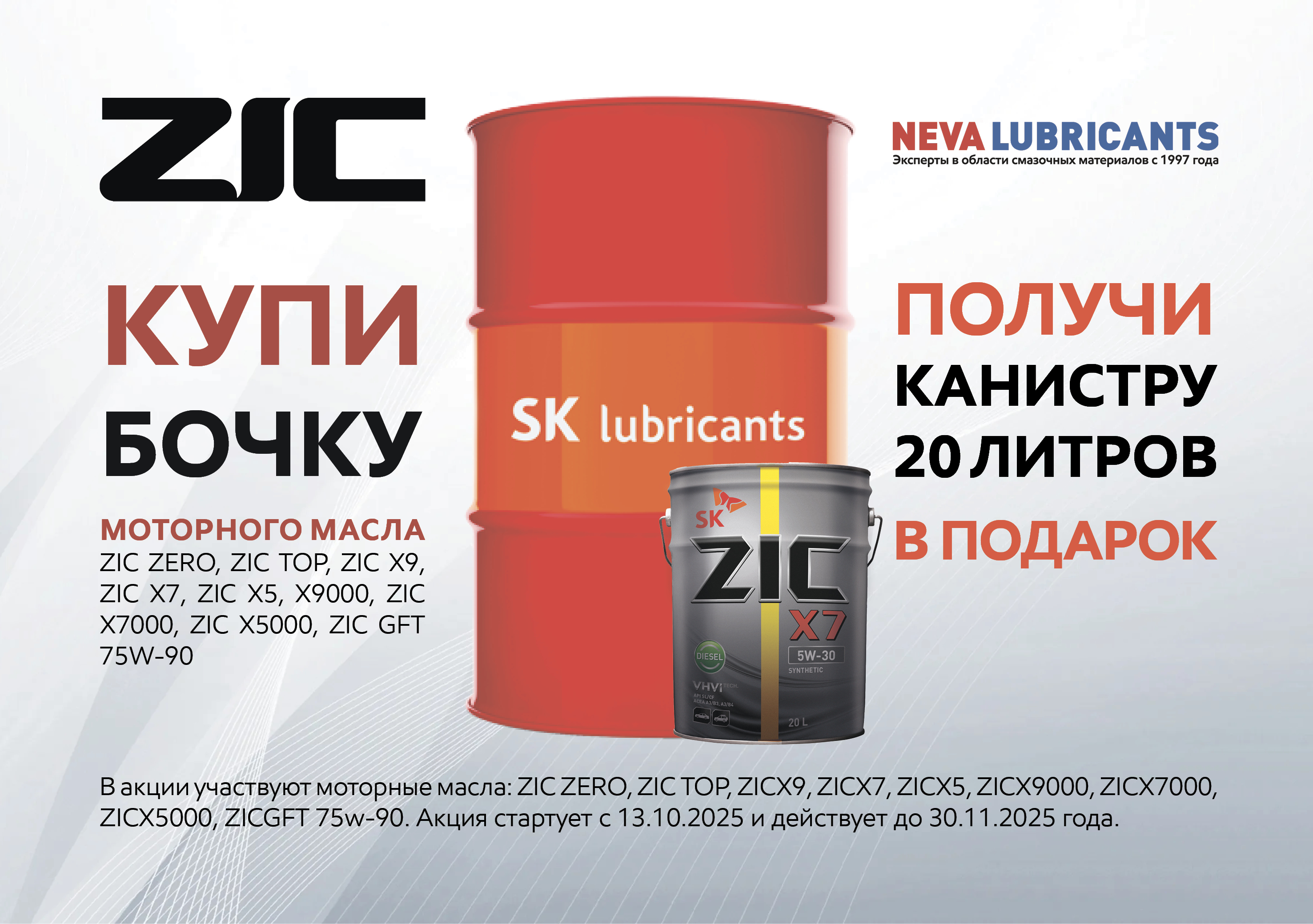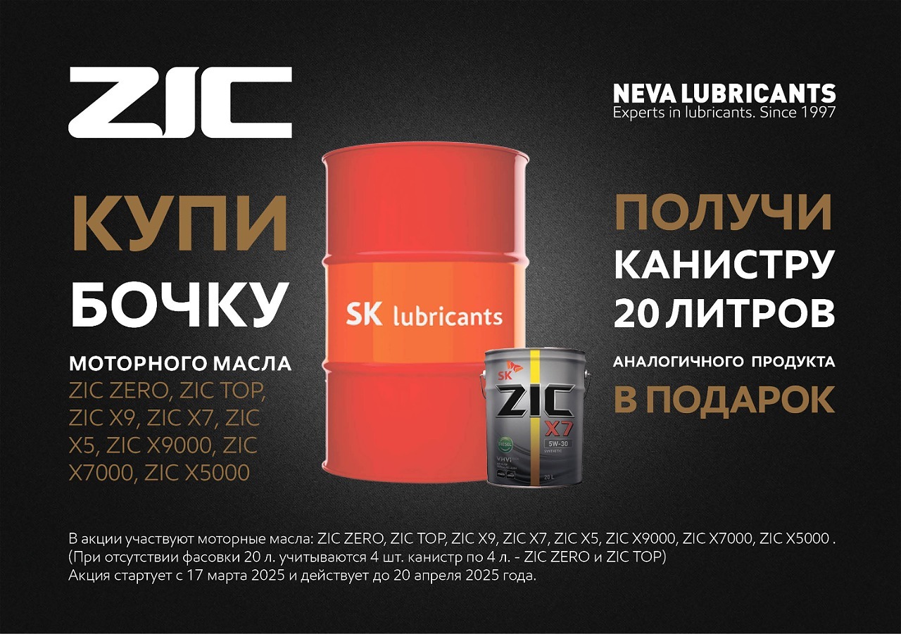 Не упустите возможность приобрести моторное масло ZIC Zero, ZIC TOP, ZIC X9, ZIC X7, ZIC X5, ZIC X9000, ZIC X7000 и ZIC X5000 по выгодной цене! В рамках акции вы получите канистру 20 литров этого же продукта в подарок! Спешите сделать покупку до 20 апреля 2025 года!